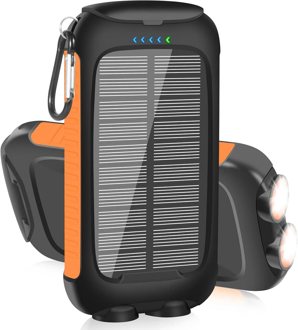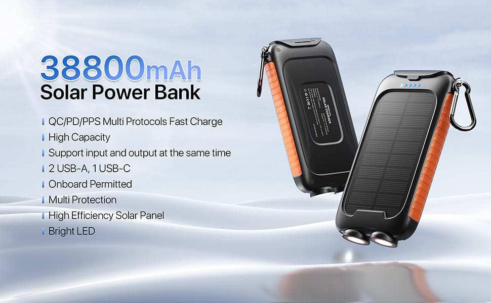 Rugged, waterproof solar power bank with dual LED flashlight. Charges 3 devices at once (2 USB + 1 Type‑C). Emergency solar charging + fast 15W output.