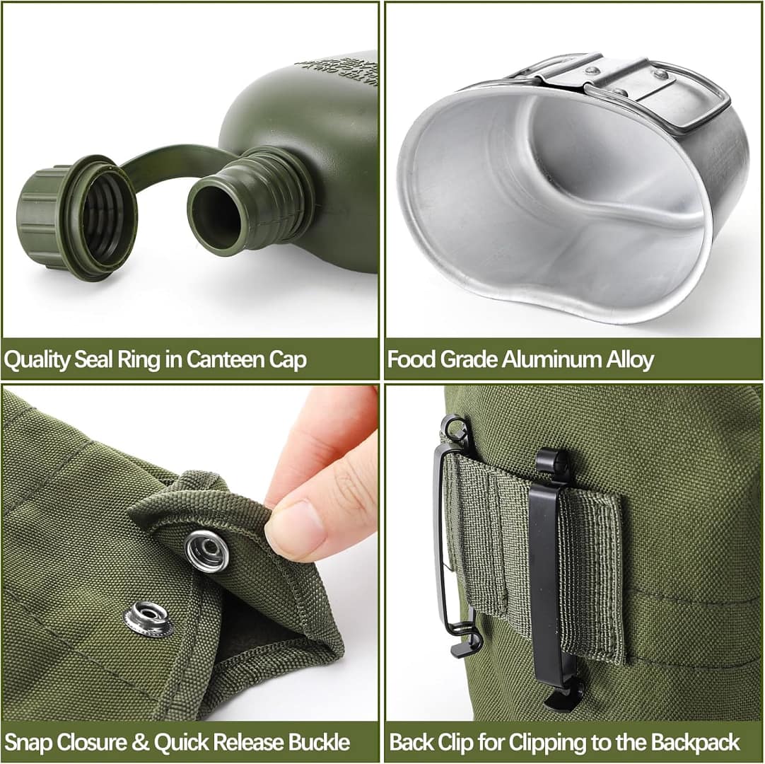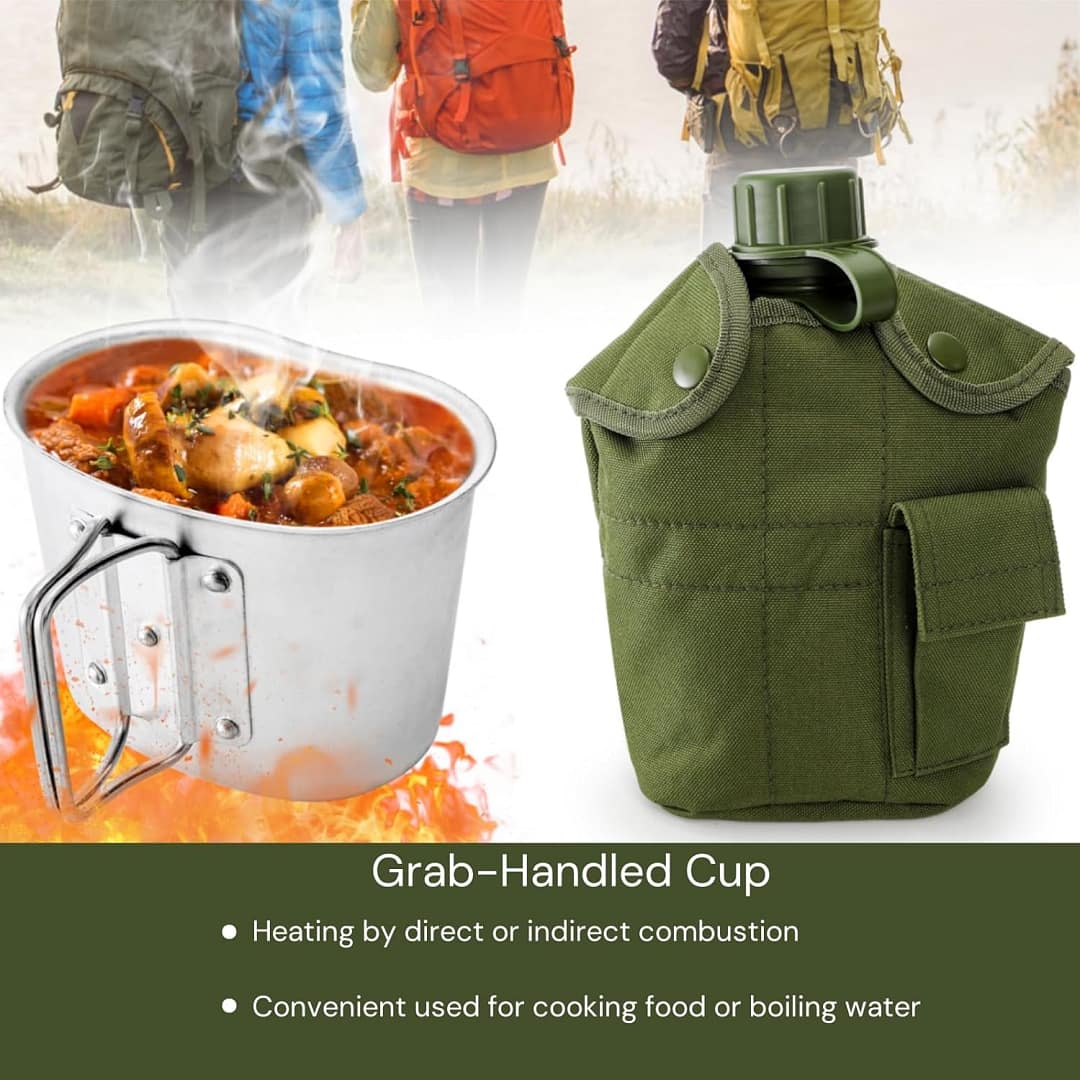 Full Military Canteen Kit: The integrated aluminum cup with a foldable handle, can be used to collect water, boil water or cook meals directly on the fire. These stainless steel utensils are designed for compact storage/organization.