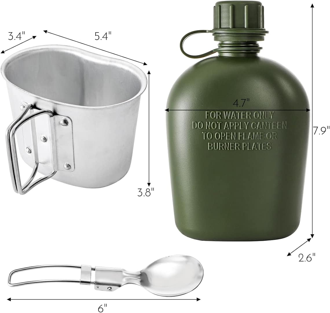 Package includes 1 water bottle, 1 cup, 1 bottle cover bag, 1 spoon, 1 fork and 1 knife. Canteen Size: 7.9″ H x 1.3″ D, Cup Size: 5.4″ L x 3.6″ W x 3.8″ H. This canteen set is a must-have for outdoor and military enthusiasts.